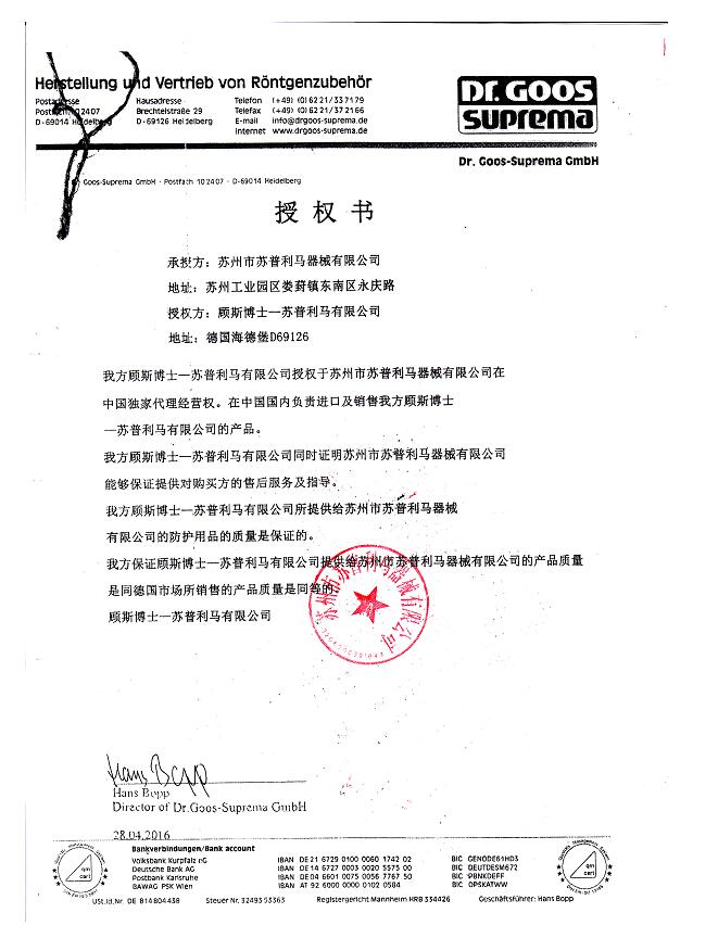 蘇州市蘇普利馬器械有限公司是專業(yè)從事醫(yī)用X射線防護系列用品、裝置、代理德國Dr.Goos-Suprema Gmbh.顧斯博士-蘇普利馬有限公司生產(chǎn)的原裝進口鉛衣及醫(yī)用觀片燈的生產(chǎn)銷售企業(yè).生產(chǎn)的X射線防護圍裙均來自美國SHIELDING公司的最新型超薄型防護材料,,具有防護性能可靠、穿戴舒適、輕便柔軟、操作自如等諸多優(yōu)點.產(chǎn)品均通過相關X射線檢測機構的檢測,達到產(chǎn)品標準的要求.X射線醫(yī)用膠片觀察燈。是采用全LFD燈光技術。具有重量輕,光源均勻,亮度高,無頻閃,不變型,使用壽命長等特點。均取得了生產(chǎn)許可及醫(yī)查看更多>>
